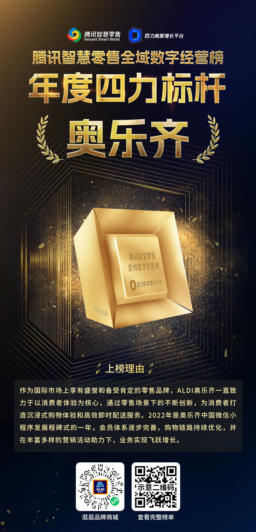 2023年4月,在腾讯智慧零售发布的“全域数字经营榜”中,ALDI奥乐齐商城微信小程序荣获"年度四力标杆”,在产品与数据生产力、运营力、组织力、商品力方面得到肯定。