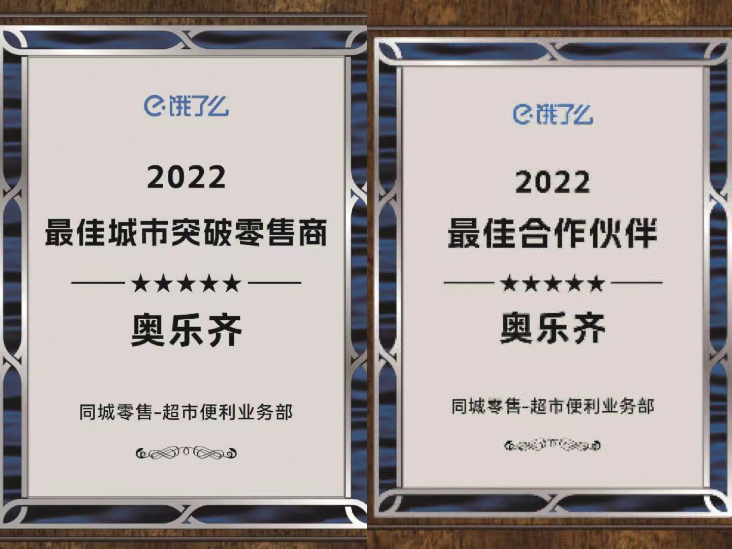 2023年6月,在饿了么首届商家零售大会中,ALDI 奥乐齐获得 “2022最佳城市突破零售商” 和“2022最佳合作伙伴”奖项。作为全国唯一一家获“2022最佳城市突破零售商”的商家, ALDI奥乐齐在零售生态方面不断创新,以提供优质商品、解决用户需求为核心为用户打造一站式购物体验 。