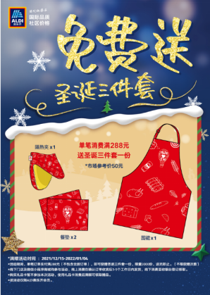 To show our appreciation for customers old and new, all shoppers will receive a free three-piece Christmas gift bag which includes baking gloves, placemat and apron with any purchase over RMB288. Promotion runs from December 15, 2021, to January 4, 2022. Please refer to the flyer for more promotion details: